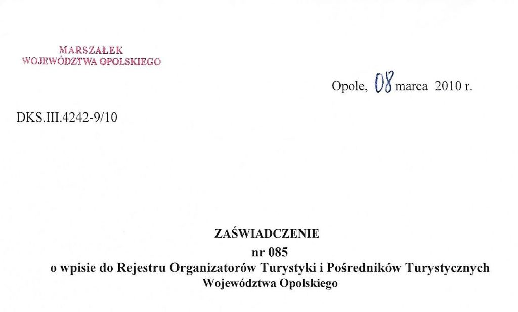 B.T. LUTECJA Piotr Leśniewski oświadcza, iż posiada wpis do Rejestru Organizatorów Turystyki i Pośredników Turystycznych nr 085, prowadzonego przez Marszałka Województwa Opolskiego, zgodnie z ustawą z dnia 24 listopada 2017r. o imprezach turystycznych i powiązanych usługach turystycznych, rozdz. 1, art. 4, pkt 8.